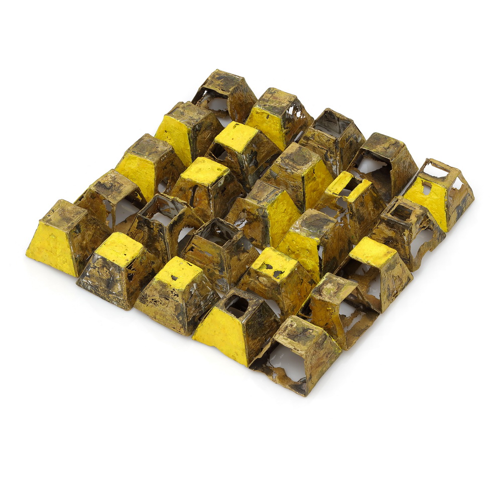 Square yellow necklace-object, brass, pigment, varnish, ca. 390 g, ca. 40 x 200 x 200 mm, 2015