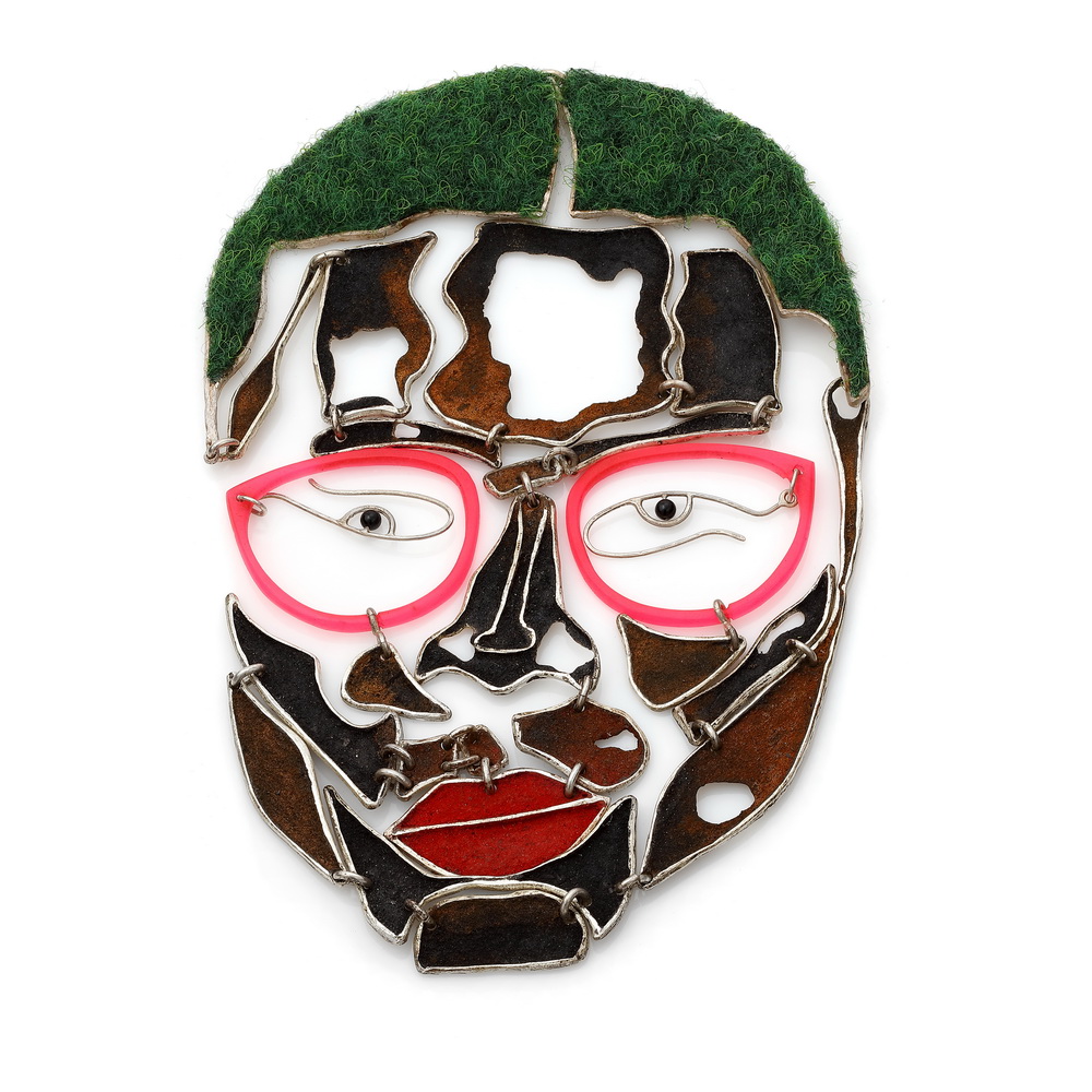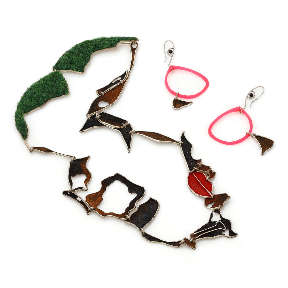 Face 2 necklace-earrings, collage, silver, pigment, rust, textile, acrylic glass, onyx, ca. 140 g, ca. 130 x 210 mm, 2021