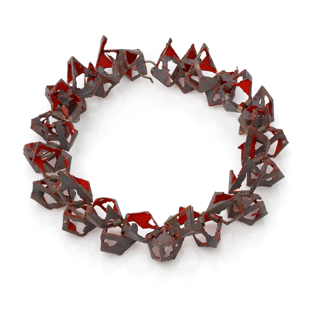The artist is inspired by the two-dimensionality of space and shapes as well as the duality of perspectives in experiencing the world. She analyses the processes of construction and disintegration that are universal on our planet, creating objects that can be deconstructed, reconstructed, and assembled again from fragments like a jigsaw puzzle. In terms of form, her work oscillates around the transformation of material subjected to goldsmithing, radically changing its quality - like paper cast in metal. Plank's objects are subjected to constant metamorphosis on all levels. They become a kind of game with the viewer. A game in which everything changes: a face becomes a necklace, a bee becomes a form of jewellery. She introduces anxiety into the ordered structures, showing the multifaceted nature and ambiguity of life experiences.