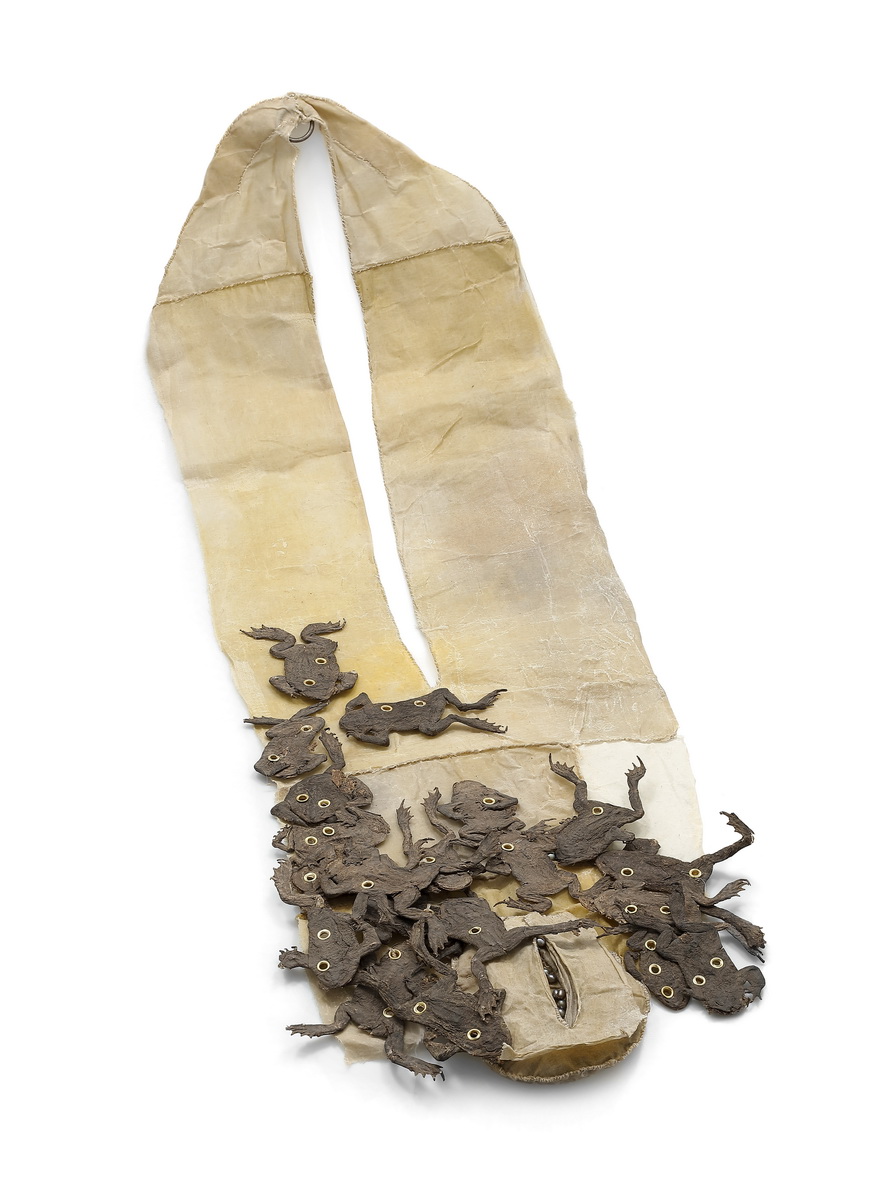 waxed fabric, faux pearls, organic objects – frog bodies, metal rivets, 360 × 860 mm, 2025